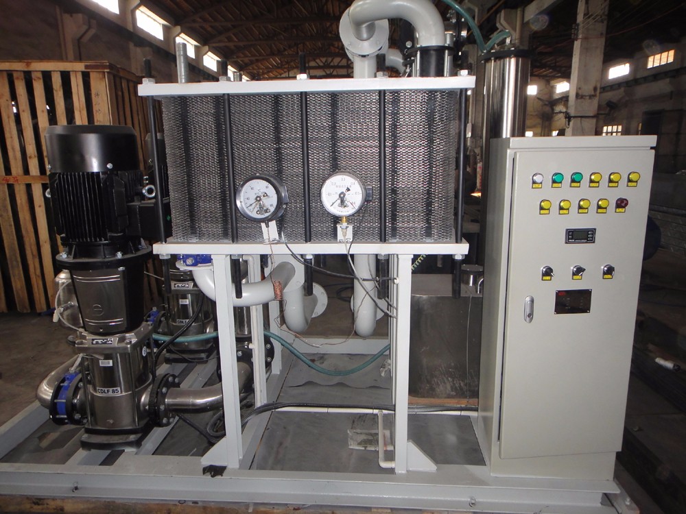 本產品由熱交換器、離子交換器泵組、高位膨脹水箱、管道和電氣控制等部件組成。水-水熱交換器采用波紋平板式,其換熱原理為將從整流器流進之載熱純水熱量以間壁傳熱方式傳遞給付水輸出機外,冷卻后的純水經加壓后返回整流器水道,周而復始,形成閉合循環冷卻回路。離子交換器采用混合床形式制取純水以維持主回路于額定水質。泵組由二臺互為工作、備用的不銹鋼水泵組成,是主回路的動力源。高位膨脹水箱按放位置高于負載主機,具自動集氣和排氣之功能。主回路管道通過外接管與負載主機冷卻水道連接成閉合循環回路。機內各容器和主水管路均采用不銹鋼材質制造。